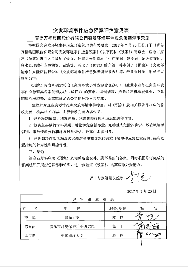青島萬福集團肉類食品公司 突發環境事件應急預案評估意見表公示